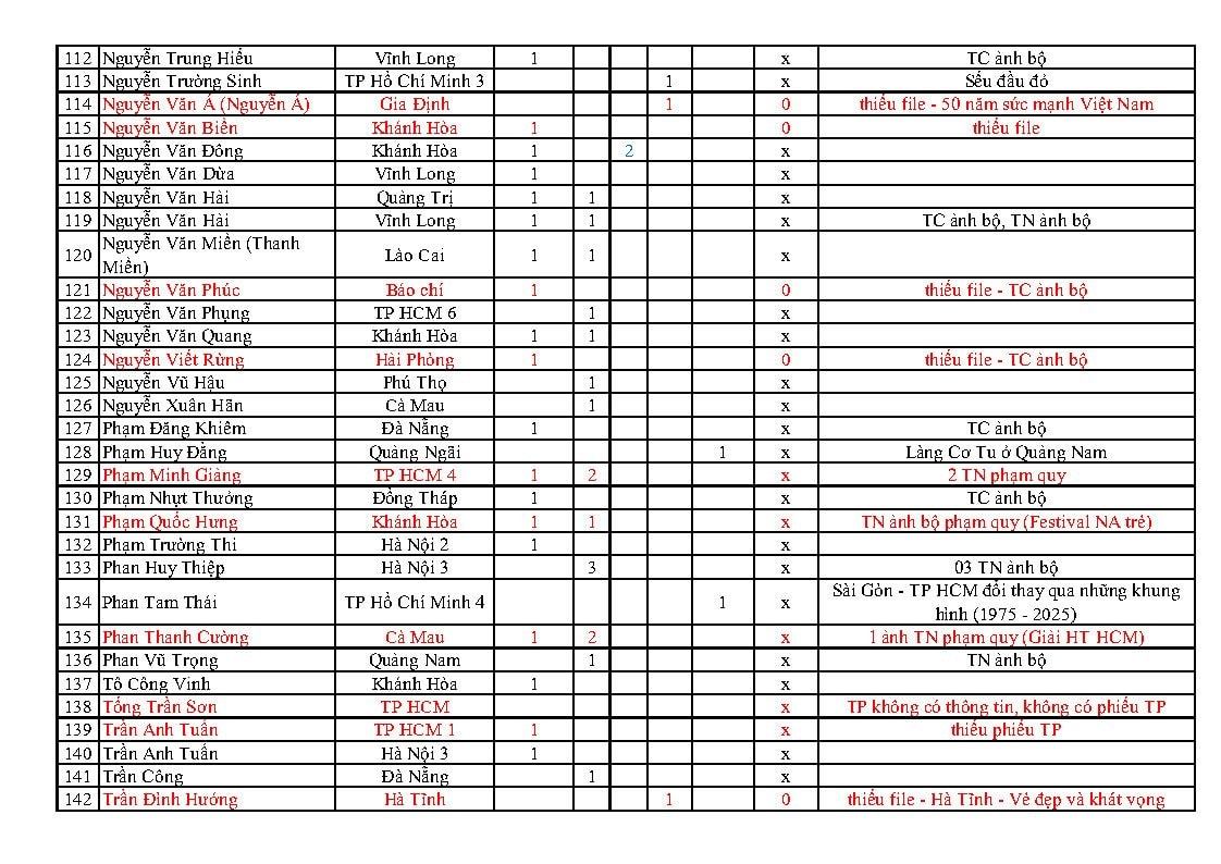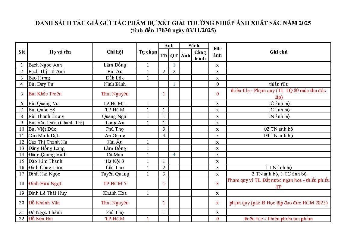 Danh sách tác giả gửi tác phẩm dự xét Giải thưởng Nhiếp ảnh xuất sắc năm 2025 (tính đến 17h30 ngày 3 tháng 11 năm 2025)