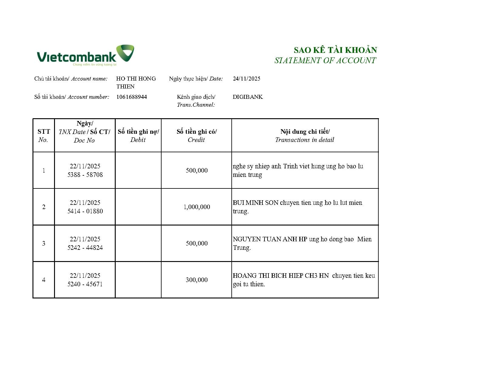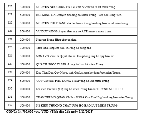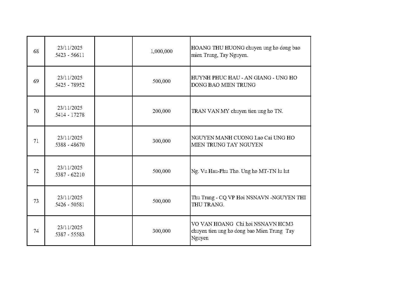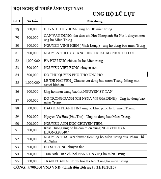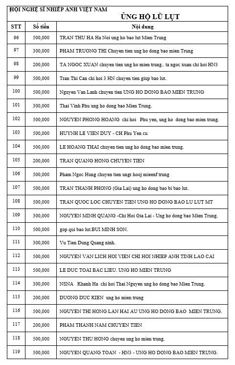 Hội Nghệ sĩ Nhiếp ảnh Việt Nam thông báo danh sách vận động quyên góp ủng hộ đồng bào miền Trung bị thiệt hại do bão, lũ gây ra.