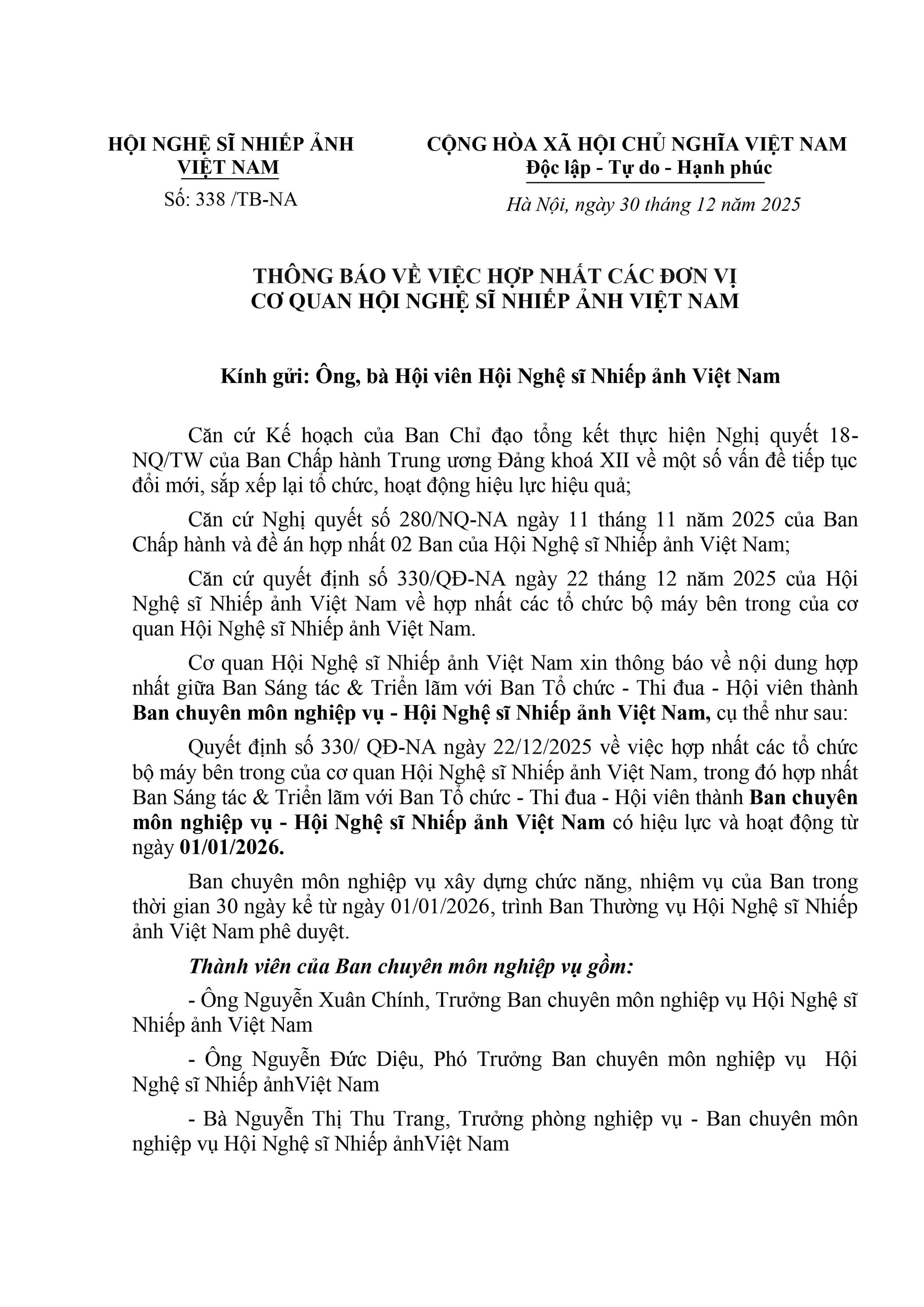 Căn cứ quyết định số 330/QĐ-NA ngày 22 tháng 12 năm 2025 của Hội Nghệ sĩ Nhiếp ảnh Việt Nam về hợp nhất các tổ chức bộ máy bên trong của cơ quan Hội Nghệ sĩ Nhiếp ảnh Việt Nam.