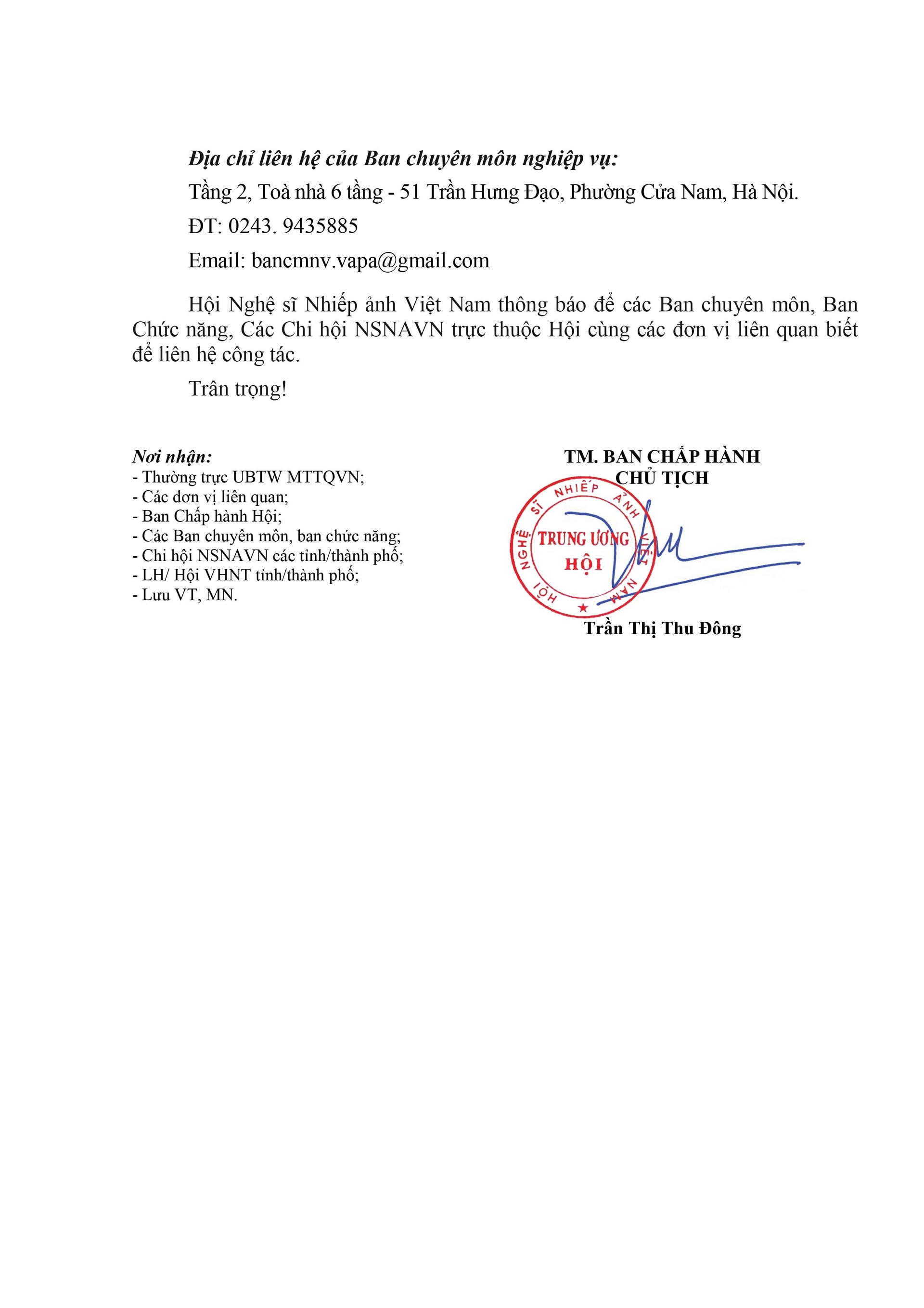 Hội Nghệ sĩ Nhiếp ảnh Việt Nam thông báo để các Ban chuyên môn, Ban Chức năng, Các Chi hội NSNAVN trực thuộc Hội cùng các đơn vị liên quan biết để liên hệ công tác.